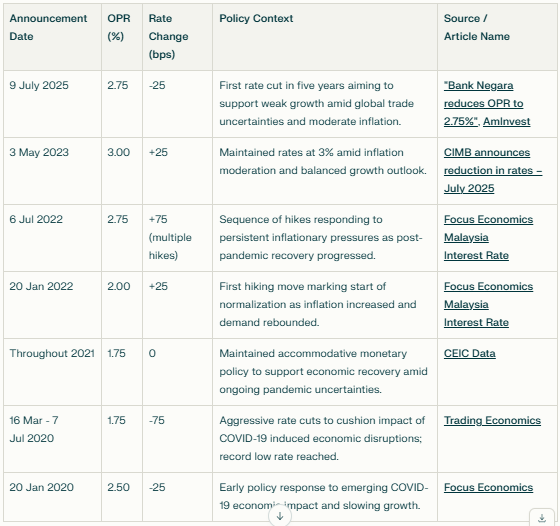 Below is a detailed table of Malaysia’s OPR announcements sorted by announcement date, including rate levels, changes, policy context, and references.