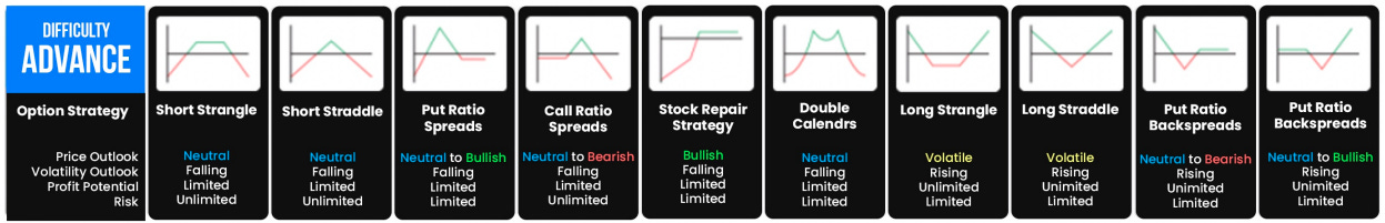 Rising Volatility: Long straddle, long strangle (benefit from big moves).