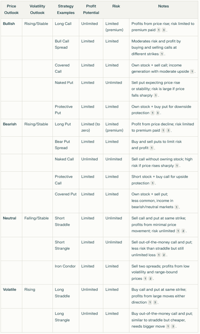 Here is a concise cheat sheet grouping popular options strategies based on Price Outlook, Volatility Outlook, Profit Potential, and Risk for quick reference and learning:
