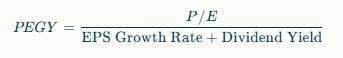 To correct this, Lynch introduced the PEGY ratio, which incorporates dividend yield (DY) alongside expected earnings growth: