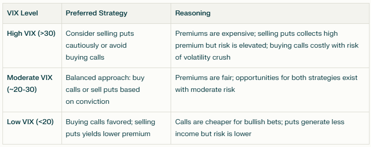 Using the VIX level as a factor in deciding whether to buy long calls or sell puts is a viable approach, but it requires understanding how volatility influences option pricing and risk.